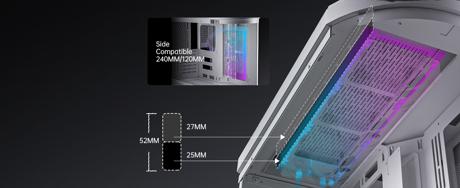 - Please note: When installing the water cooling at the top, please ensure that the thickness of the water cooling and fan does not exceed 52MM. If it exceeds 52MM, please install the motherboard and the CPU power cable in advance, and then install the water cooling last to avoid the situation where the water cooling is too thick and the wiring cannot be routed.
