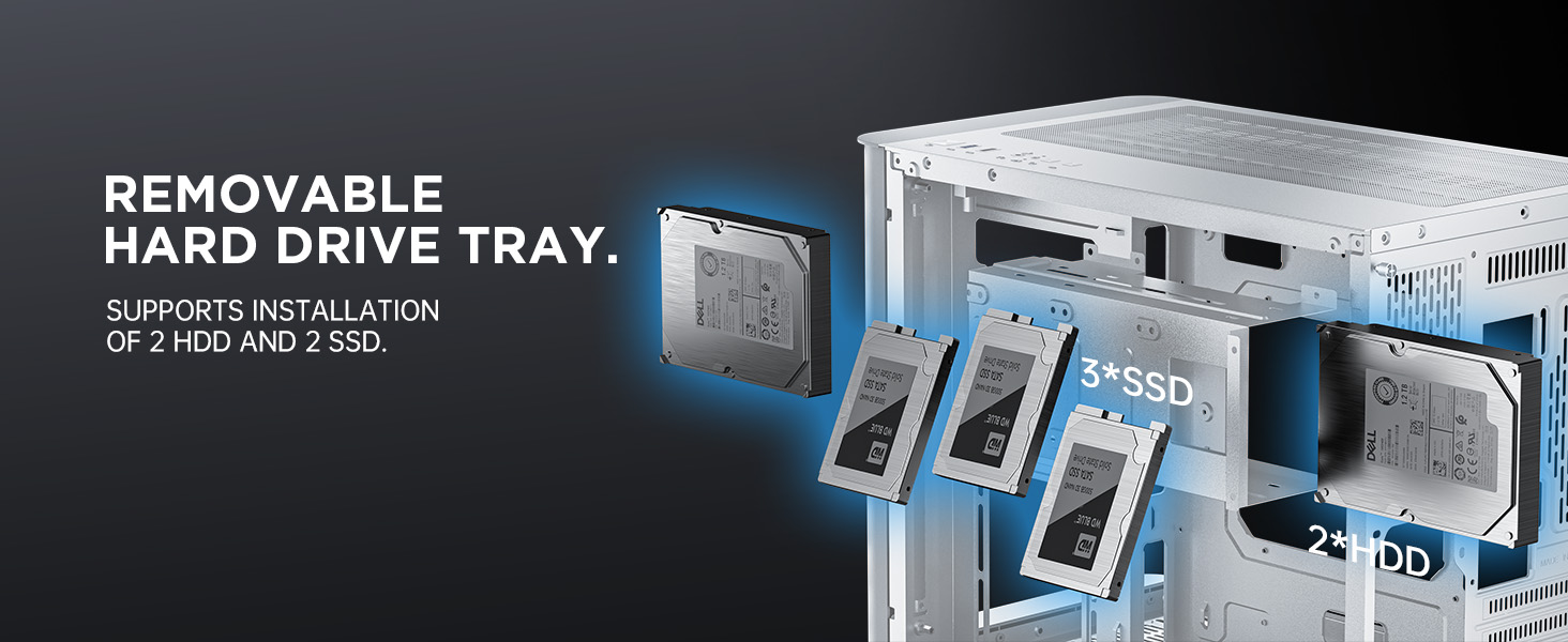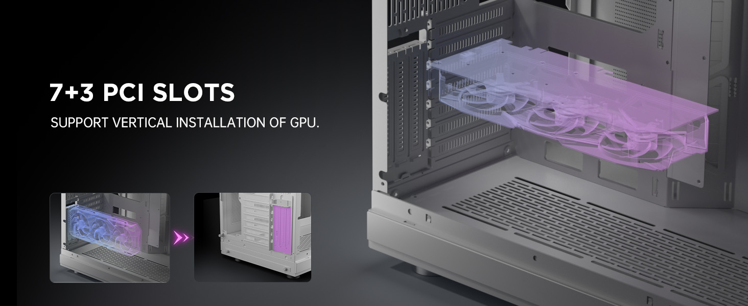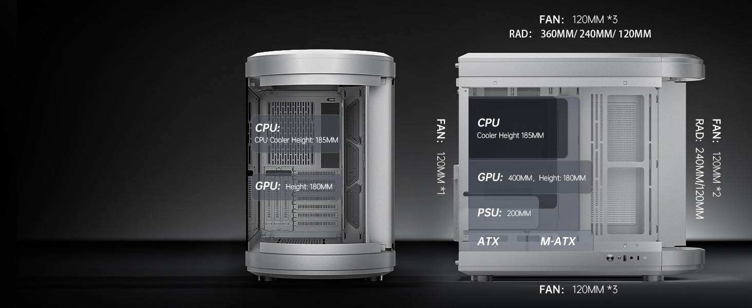 - [Specification]:Size: 518MM(L)*310MM(W)*460MM(H). Supports ATX, Micro ATX, and ITX motherboards; Max GPU size: 400MM (L) x 180MM (H) with 7 horizontal and 3 vertical PCIe slots, Supports vertical GPU installation GPU ; max CPU cooler height: 185MM; Max power supply length: 200MM; Radiator support: Top 360mm/240mm, Side 240mm; Fan support: Top 120MM*3/140MM*3, Bottom 120MM*3, Side 120MM*2, Back 120MM*1; drive bays: 2 x 3.5" HDD, 2 x 2.5" SSD; I/O panel: 1 x Type-C (10Gbps), 1 x USB 3.0, 1 x HD Audio; Material: SPCC Steel + tempered glass.