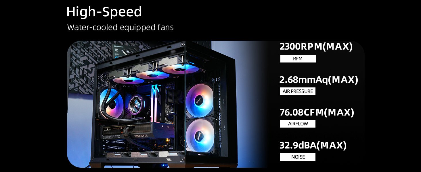 • Paired with 2300 RPM fans providing 76 CFM airflow and 2.68 mmH₂O static pressure, optimized for quiet yet efficient cooling.