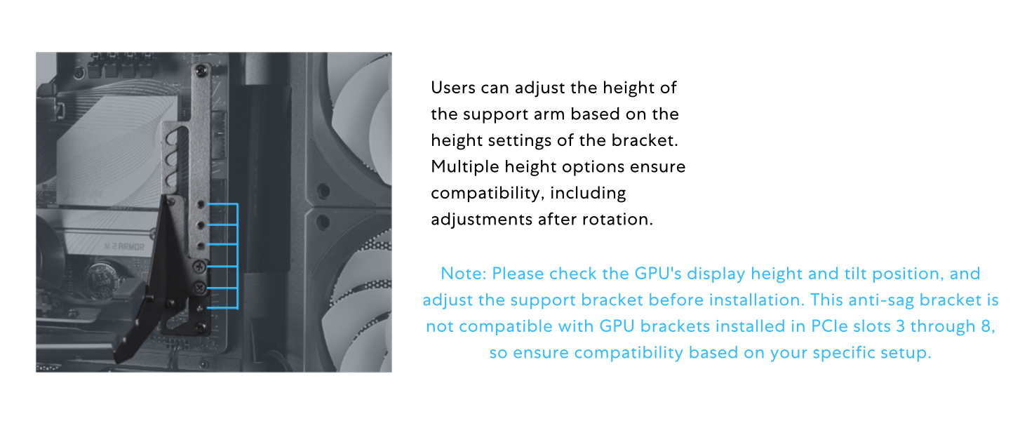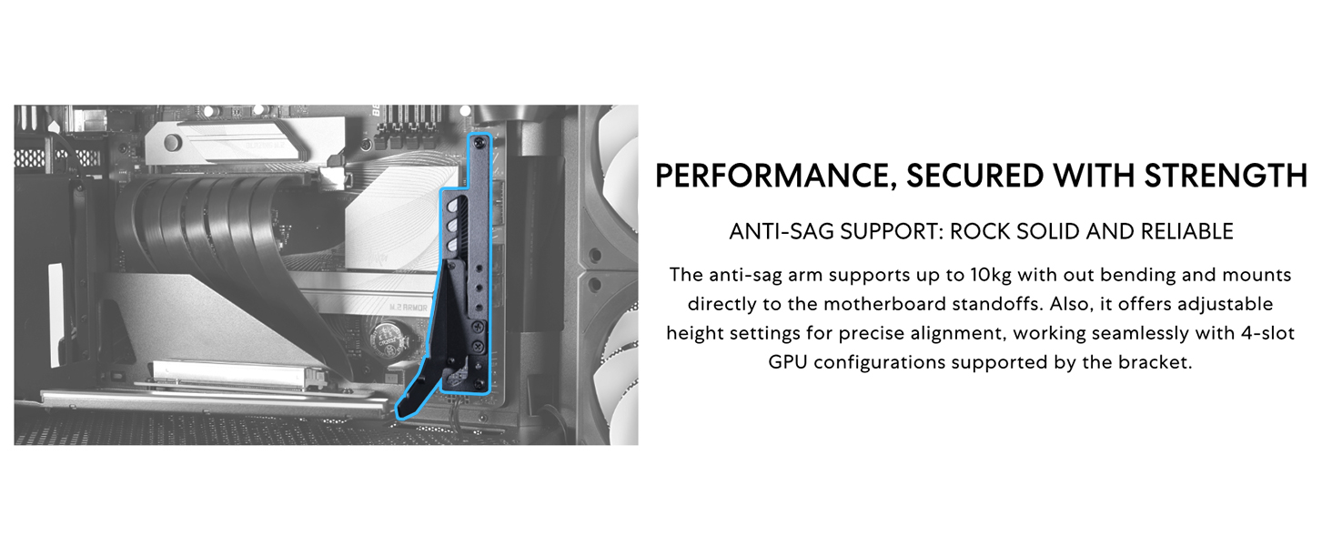 Special Feature : (function(f) {var _np=(window.P._namespace("DetailPageProductOverviewTemplatesJava"));if(_np.guardFatal){_np.guardFatal(f)(_np);}else{f(_np);}}(function(P) { P.when('A').execute(function(A){ A.on('a:truncate:po-attribute-truncate-8:updated', function(data) { var isTruncated = !data.truncateInstance.getIfTextFits(); var seeMoreElement = document.getElementById('po-attribute-see-more-id-8'); if(seeMoreElement) { seeMoreElement.style.display = isTruncated ? '' : 'none'; } }) }); })); Adjustable Height and Tilt, High-Speed PCIe 5.0 Riser Cable, Anti-Sag Support Arm with RGB Lighting, Compatibility with Most ATX Cases See more