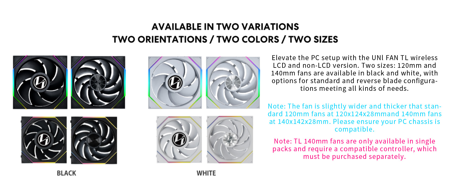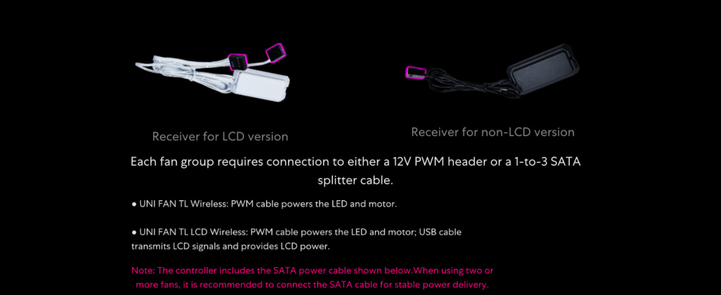 - Wireless Controller: The controller is essential to operate the Uni Fan wireless version. Please note that the single pack does not include a controller, must be purchased separately.Both the 3-Pack and PW24-1W-T come with a controller. Additionally, the 3-Pack package provides a PWM 1-to-3 cable for convenient connectivity.