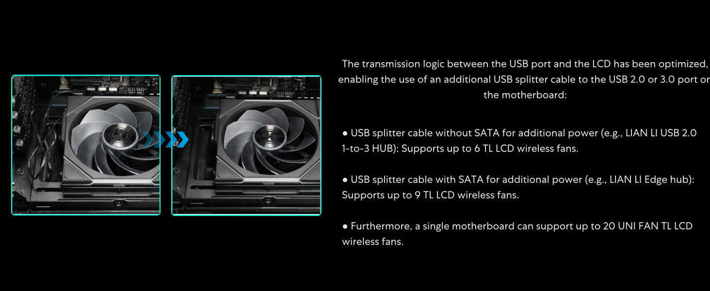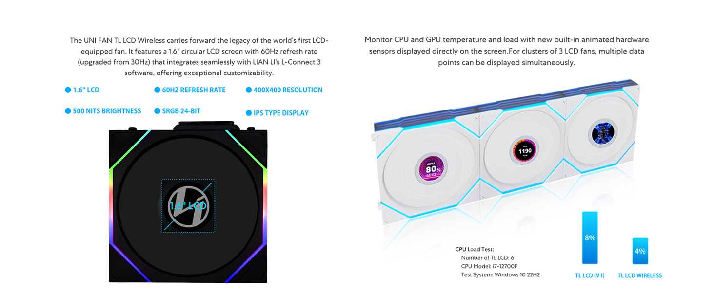 - 2.4 GHz Wireless Signal for RGB & Fan Control: Next-gen RGB connectivity for PC case fan managing the 1.6" LCD (LCD version) and RGB lighting with a wireless controller. Customize your system’s style by uploading your own personalized MP4 / GIF / JPG / PNG.