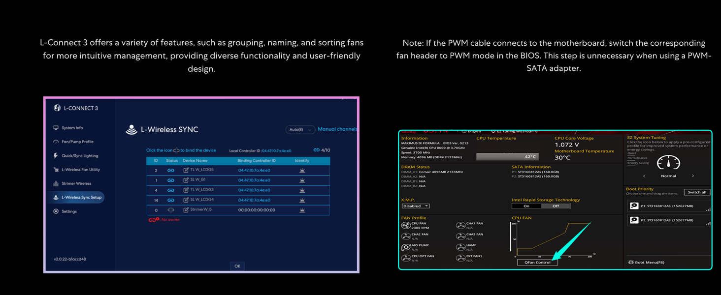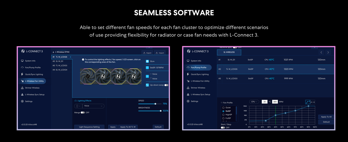 - Quick Software Setup: The L-Connect 3 software provides the ability to set different fan speeds for each fan cluster to optimize different scenarios. Monitor the temperature and loading of your CPU and GPU, as well as the fan speed, instantly with built-in hardware monitor dashboards on the screen. The fan helps deliver more airflow and static pressure.